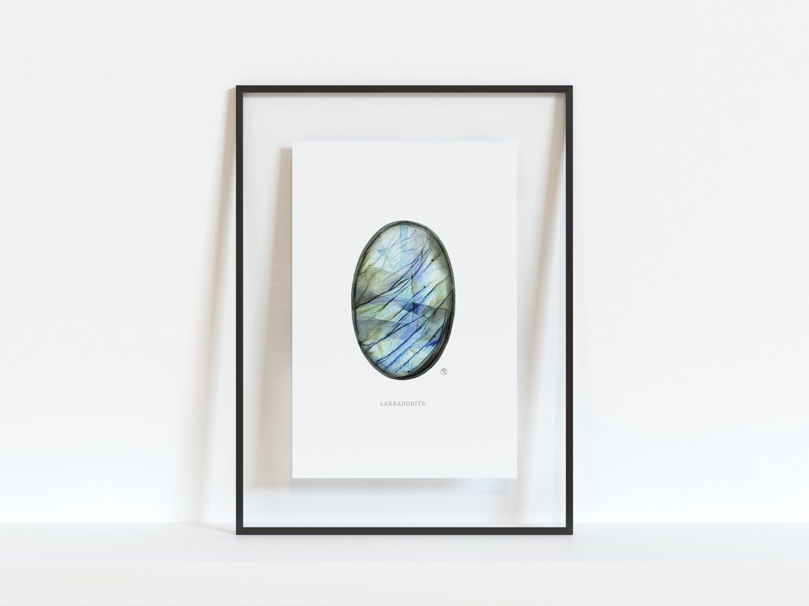 Impression d’une aquarelle originale représentant un cabochon de labradorite bleue et ses beaux reflets bleutés à verts.